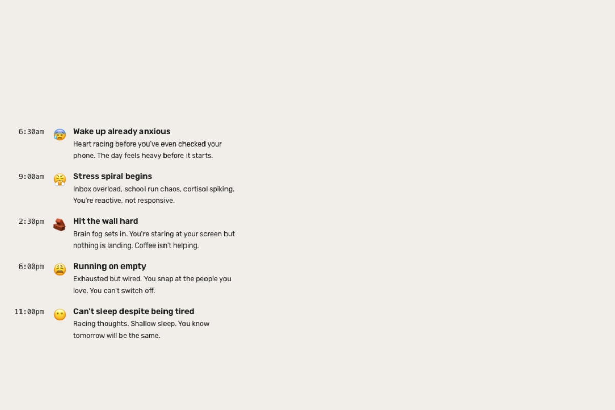 Before you've even opened your laptop, your cortisol is spiking. The school run, the inbox, the mental load — it all hits at once. You start the day already behind.
